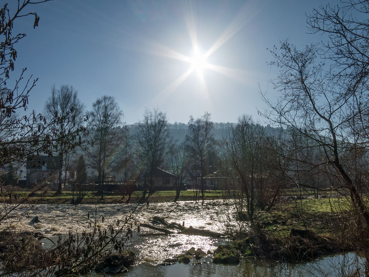 Durch das fehlende Laub bekomme ich nicht nur Sonne ab sondern hab auch immer wieder den Blick auf die Wied, die sich im Tal entlang schlängelt und in der Sonne glitzert.