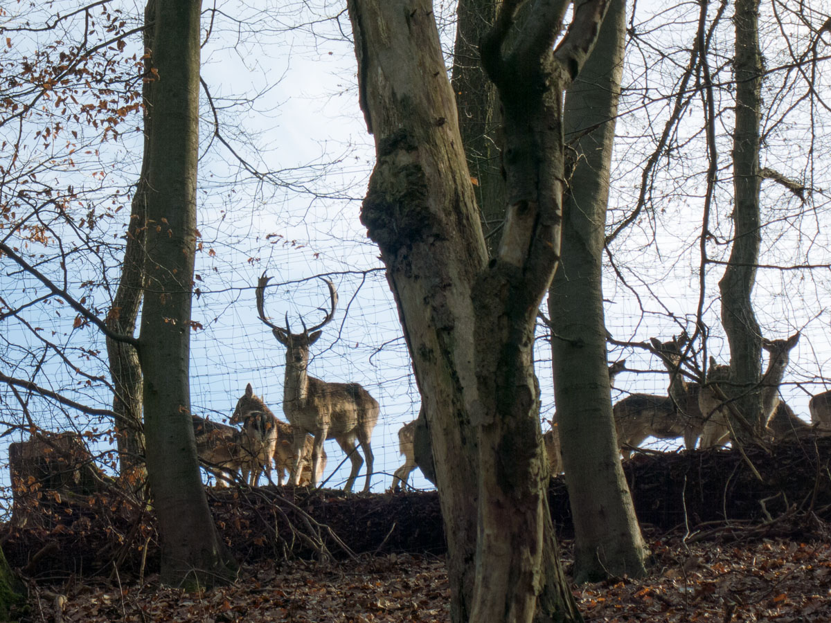 IMG_7588Nun erkenne ich, dass es Damwild in einem Gehege ist. Der Damhirsch steht inmitten seiner Mädels und lässt mich nicht aus den Augen.