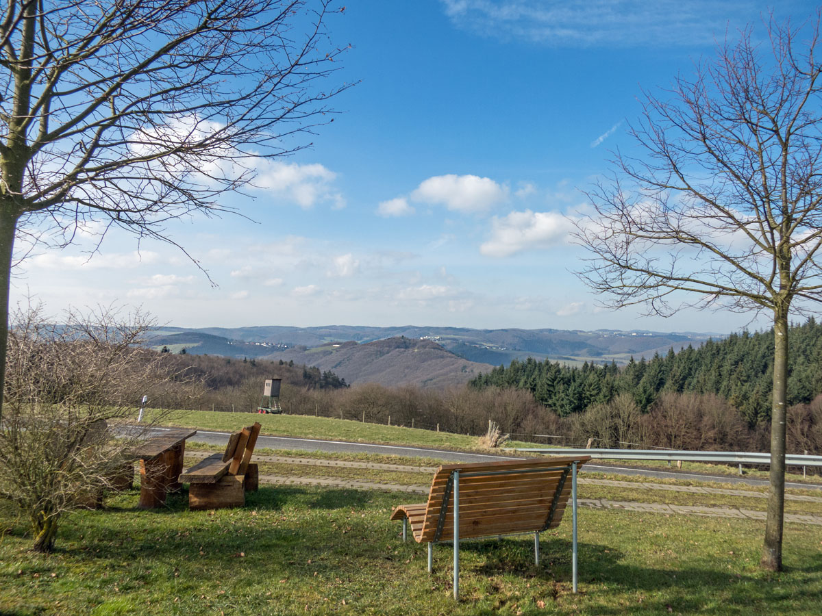 Der Blick kann über das Wiedtal und die Höhen des Westerwaldes schweifen. Ein wunderbar einsames Plätzchen in der Sonne.
