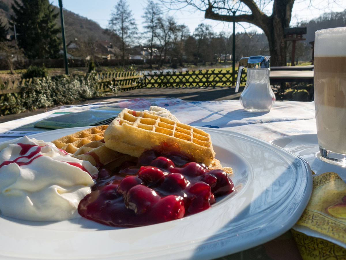 IMG_7722Ich frage drinnen freundlich nach, ob ich auch draußen sitzen kann und bestelle Café und Heiße Waffeln mit Kirschen, Sahne & Eis.