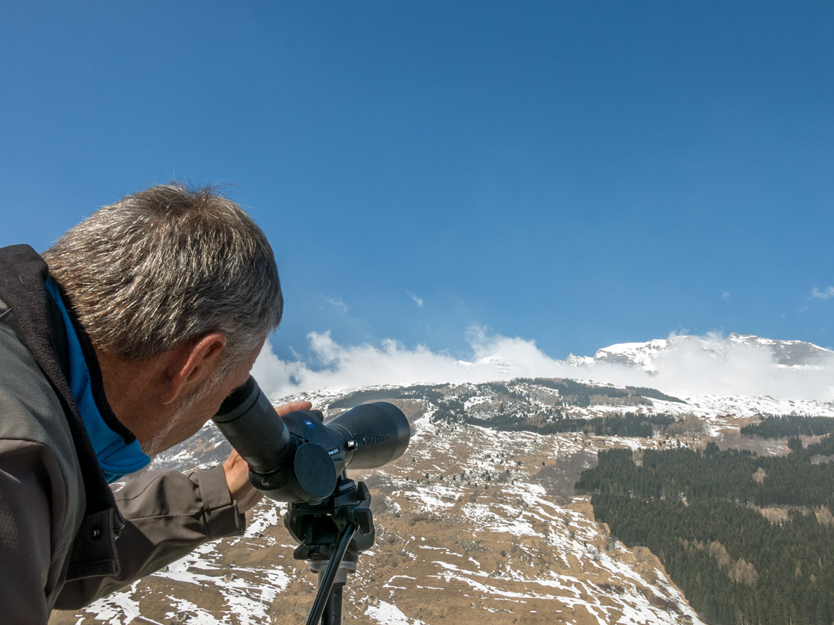Aber ich wollte ja nicht nur das Dorf von oben betrachten, sondern auch Tiere sehen. Edi nahm sein Fernglas und suchte die Umgebung ab. Als er was entdeckt hatte, stellte er das Spektiv auf und justierte auf die entsprechende Stelle. Ich schaute hindurch und hatte einen Wow-Effekt! Da oben kreisten majestätisch zwei Steinadler in der Luft.