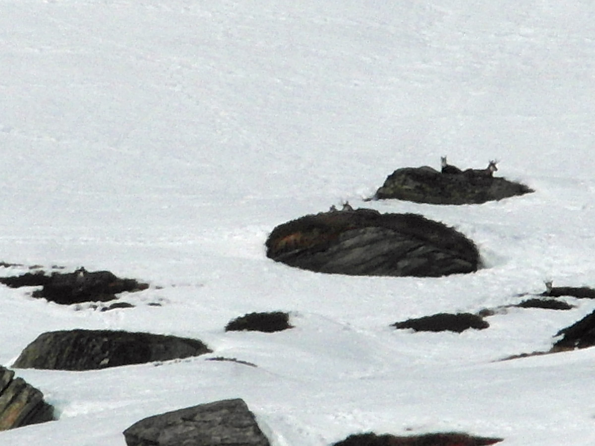 Wir konnten eine Gruppe von 9 Gämsen beobachten, die sich zunächst auf einigen Felsen sonnten und später weiter hinauf bewegten.