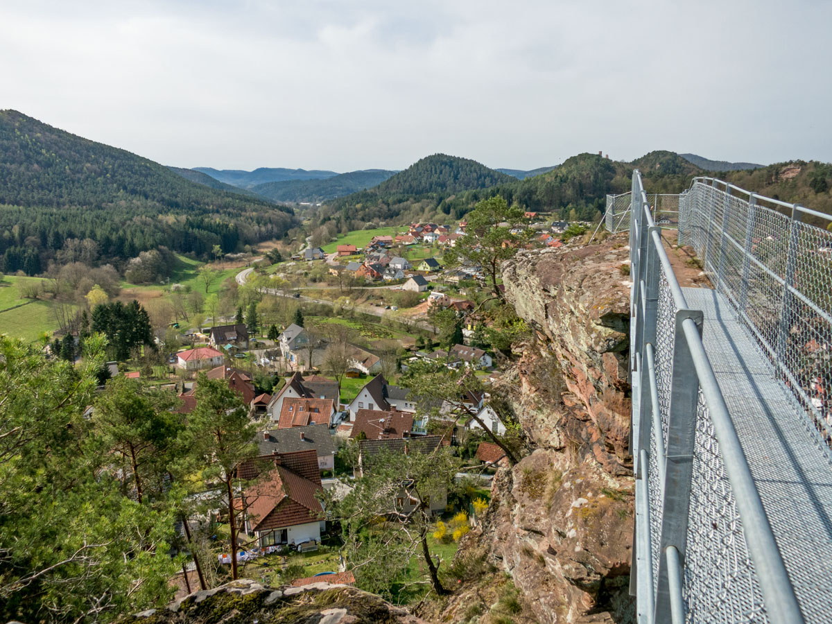 Ein neues Plateau mit einer Gitterbrücke, welches weit hinausragt, offeriert einen Blick auf Erfweiler und den gegenüberliegenden Dahner Burgen, zu denen ich im weiteren Verlauf noch gelangen werde.