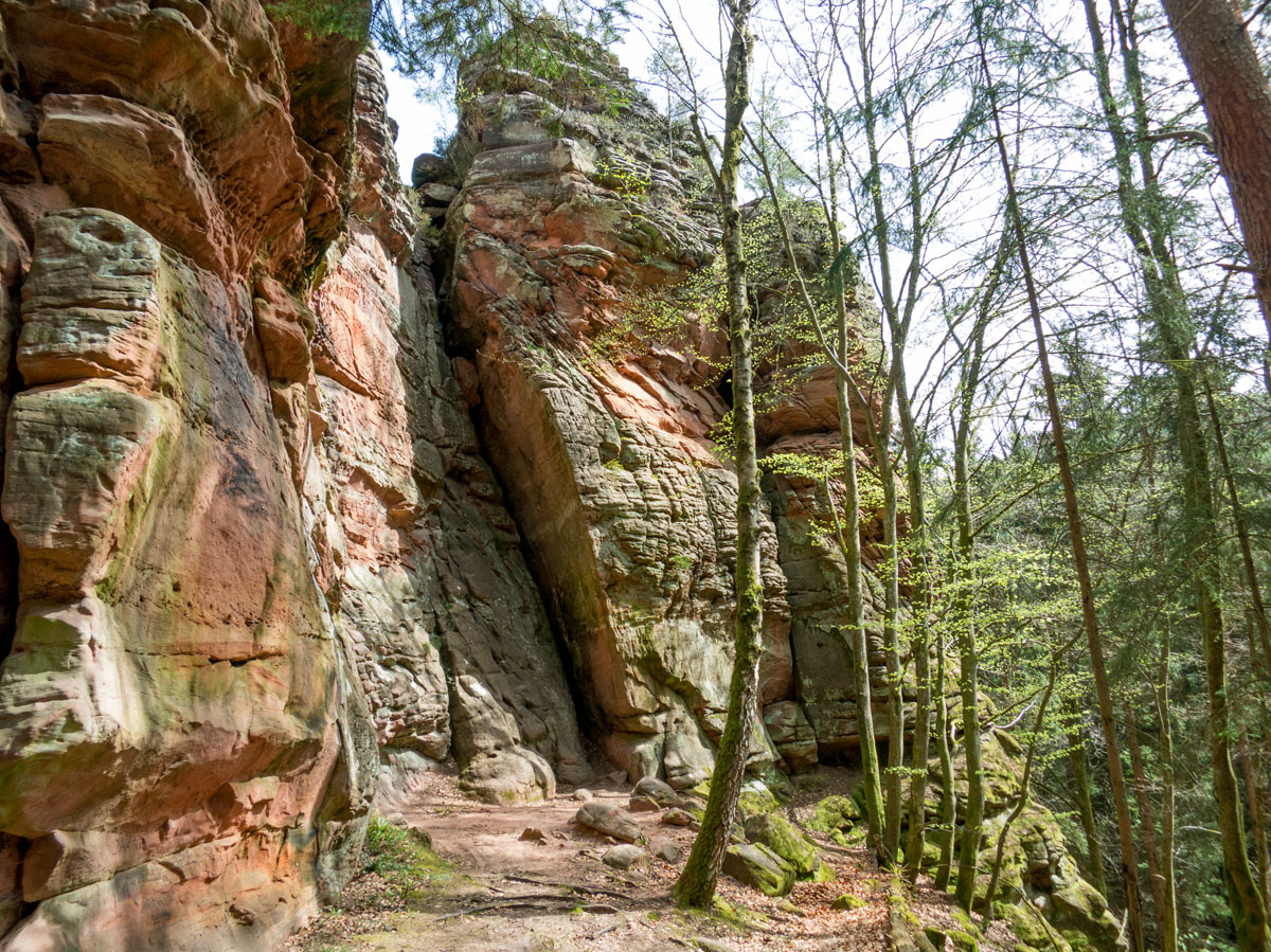 Doch als ich über den Pfad an der Südseite entlang gehe, merke ich wie langgezogen dieser riesige Buntsandsteinfelsen überhaupt ist.