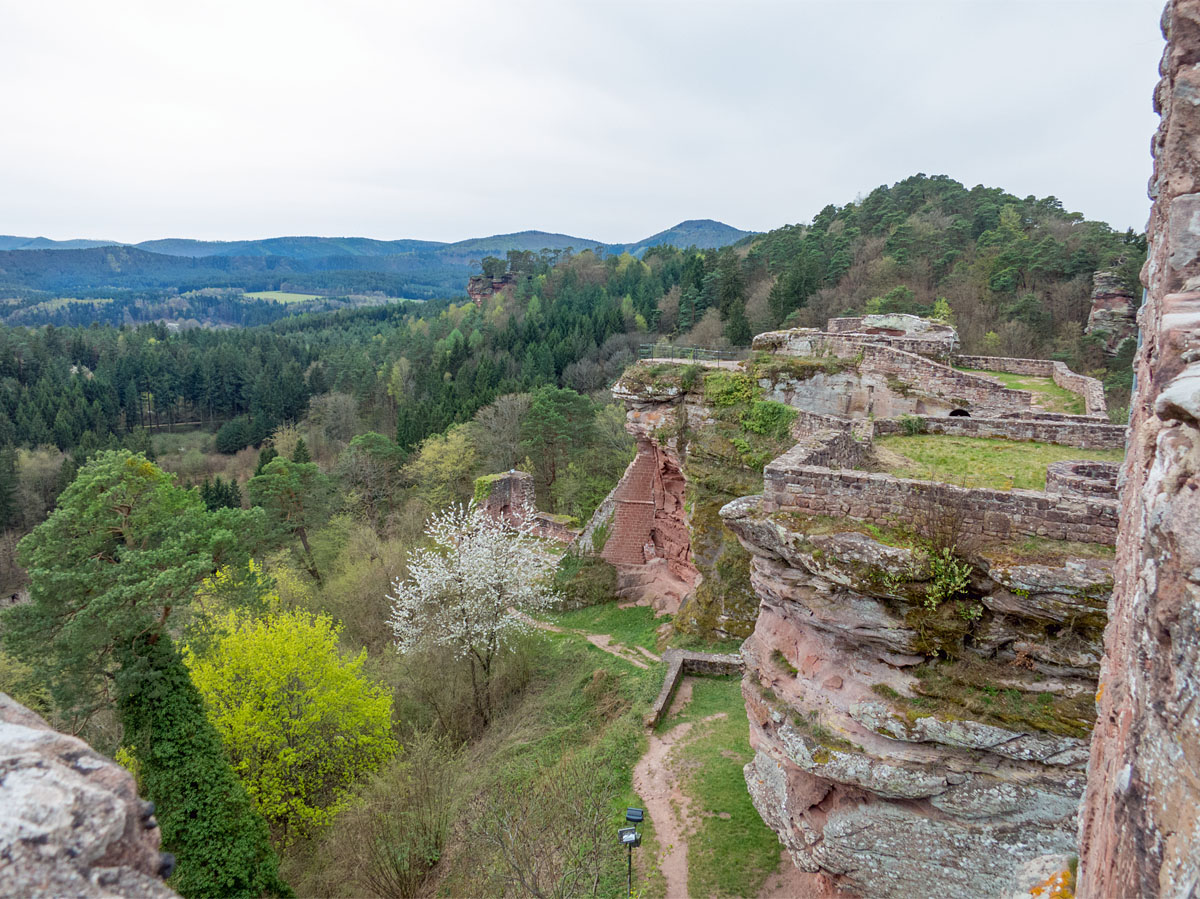 Von hier aus geht es nach der Rast jedoch nicht über den Waldpfad hinab nach Erfweiler, sondern rechts daran vorbei. So gelange ich zum Löffelfels und suche mir auf den schmalen Pfaden den richtigen Weg. An einer Stelle bietet sich der Blick auf Erfweiler und den Hahnfels mit seinem Plateau, wo ich ganz zu Anfang der Tour stand.