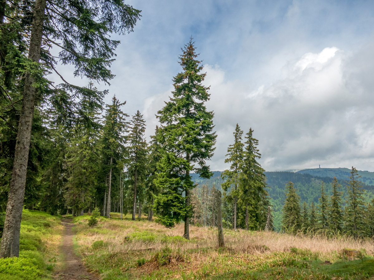 Der längere Abschnitt über den Raimartiweg bietet nur ab und zu Aussichten. Von einer Bank aus hat man einen Blick auf den Hochfirst, der oberhalb des Titisees liegt und an seiner markanten Wiesenfläche zwischen den Weißtannen gut zu erkennen ist.