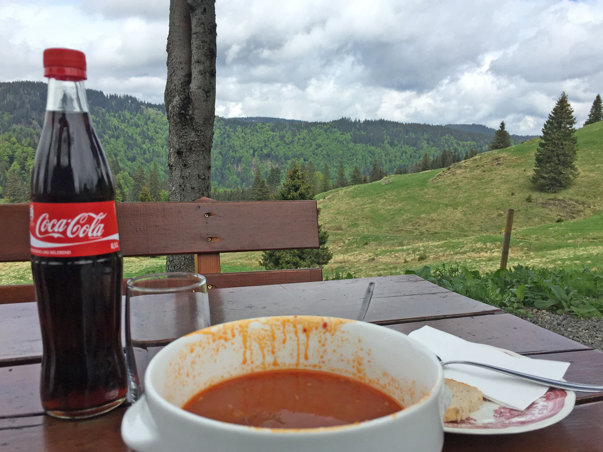Viel ist hier um die Zeit nicht los, also suche ich mir einen geschützten Platz an der Hütte und bestelle mir eine Bärlauchsuppe.