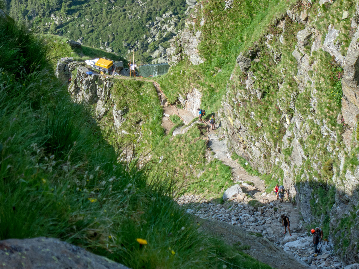 Am Eingang der Scharte sehe ich einen Mann in einem weißen T-Shirt, der schon seit mehreren Minuten immer dort hin und her geht. Ich frage nach und mir wird erklärt, dass dies Arbeiter sind, die derzeit an der Scharte den Weg instand setzen.