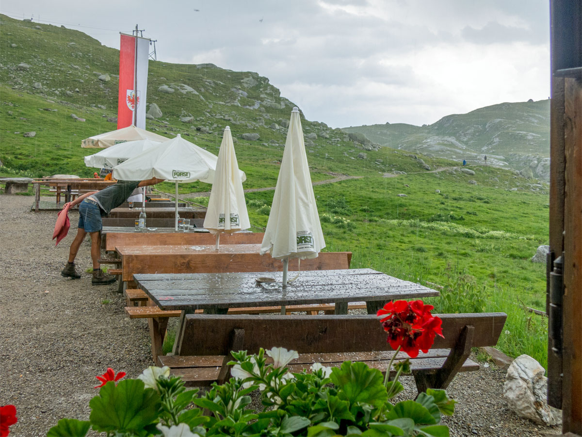 IMG_5806Die Terrasse ist gut besetzt. Auf einmal fängt es an zu regnen: erst ein paar Tropfen, dann wird es deutlich stärker. Alles wird eingesammelt, die Sitzkissen, die Gläser und Teller und die meisten flüchten in die Hütte.